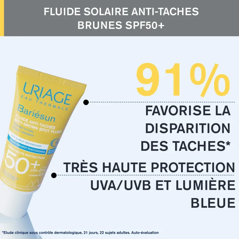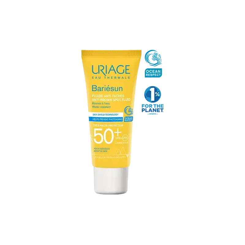URIAGE Bariésun Fluide Anti-Taches SPF50+ 40ml est un soin solaire visage de très haute protection spécialement conçu pour les peaux sensibles sujettes aux taches pigmentaires (taches brunes, masques de grossesse, taches de vieillesse, etc.). Ce fluide offre une protection complète tout en corrigeant et prévenant l'apparition des taches.
