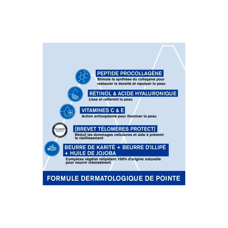 Cette crème est idéale pour les peaux matures, sèches à très sèches, qui présentent des rides marquées, une perte de densité, de fermeté et un manque d'éclat.