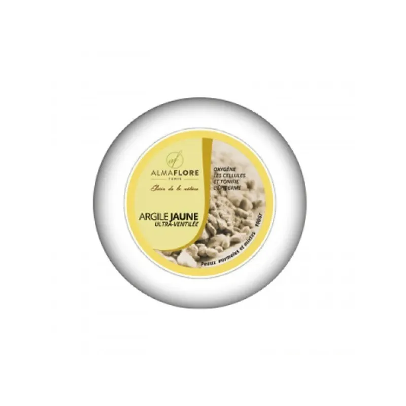ALMAFLORE Argile Jaune 100 gr est une poudre d'argile minérale extraite de gisements naturels. Sa couleur jaune est due à sa richesse en Illite et à sa forte teneur en oxydes de fer (ferrique). Elle possède une composition intermédiaire entre l'argile Verte (très absorbante et purifiante) et l'argile Rouge (stimulante et douce). L'argile Jaune est ainsi reconnue pour ses propriétés purifiantes et absorbantes modérées, ce qui la rend idéale pour les peaux mixtes, normales ou grasses qui sont sensibles. Elle est surtout appréciée pour son action stimulante, tonifiante et reminéralisante : elle aide à oxygéner les cellules et à raviver l'éclat des teints ternes et fatigués. C'est le soin "bonne mine" par excellence.