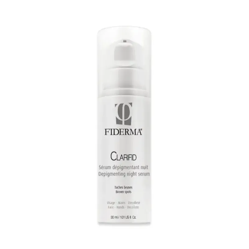 Le Sérum Dépigmentant Nuit Clarifid de Fiderma est un soin intensif conçu pour cibler et corriger les taches brunes, l'hyperpigmentation et les irrégularités du teint pendant la nuit. Sa formule haute tolérance, à la texture légère et non grasse, agit en profondeur pour unifier le teint, éclaircir les taches existantes et prévenir leur réapparition. Enrichi en actifs dépigmentants puissants, il favorise le renouvellement cellulaire et inhibe la production de mélanine pour une peau plus lumineuse, plus uniforme et sans défaut. Il est idéal pour un traitement ciblé et efficace pour retrouver un teint éclatant et sans taches au réveil.