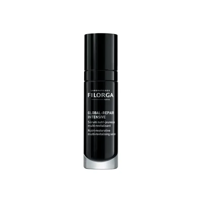 Le FILORGA GLOBAL-REPAIR INTENSIVE SÉRUM NUTRI-JEUNESSE 30 ML est un sérum anti-âge global ultra-concentré, spécialement formulé pour les peaux dévitalisées, et agissant sur tous les signes visibles du vieillissement. Ce soin de 30 ml offre une réponse intensive aux problématiques de déshydratation, rides marquées, manque de fermeté, ovale relâché, manque d'uniformité et teint terne. Sa formule unique s'inspire des techniques de médecine esthétique. Il contient le facteur de réparation intense (IRI), un complexe breveté qui combine des céramides, omégas et vitamines pour restaurer la barrière cutanée et nourrir intensément la peau. Le cœur de sa formule réside dans le NCEF (New Cellular Encapsulated Factors), le complexe polyrevitalisant signature de Filorga, ici dans une concentration optimale, pour stimuler la régénération cellulaire et améliorer globalement la qualité de la peau. Le sérum intègre également un mélange de peptides et d'acide hyaluronique pour une action ciblée sur les rides et le relâchement. Sa texture sérum fluide et soyeuse pénètre rapidement, laissant la peau douce, confortable et visiblement plus jeune, lumineuse et revitalisée. C'est un soin idéal pour une cure intensive ou une utilisation quotidienne en pré-soin.