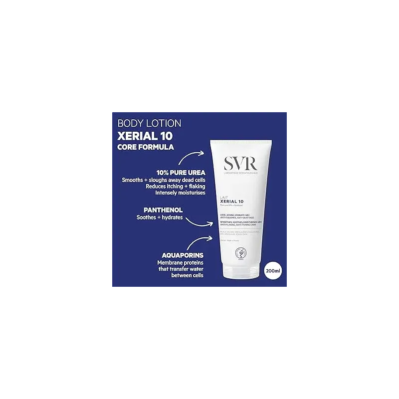 Le SVR XERIAL 10 Lait de Corps est un soin hydratant intensif conçu pour les peaux sèches, rugueuses ou sujettes aux squames. Enrichi en 10% d'urée pure, il élimine efficacement les cellules mortes, lisse la peau dès la première application et procure une hydratation durable pendant 48 heures.