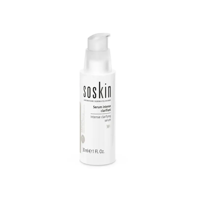 Le Sérum Intense Clarifiant SOSKIN est un soin ciblé et concentré, spécifiquement formulé pour corriger les troubles pigmentaires et les irrégularités de couleur de la peau (visage et décolleté). Ce sérum agit de manière intensive grâce à son complexe d'actifs clarifiants pour réduire l'intensité des taches brunes existantes (taches solaires, mélasma, marques résiduelles d'imperfections) et pour prévenir l'apparition de nouvelles. Il offre également une action exfoliante douce en surface qui stimule le renouvellement cutané, pour lisser visiblement la peau et unifier rapidement le teint. Sa texture fluide, légère et hydratante est confortable pour un usage quotidien.
