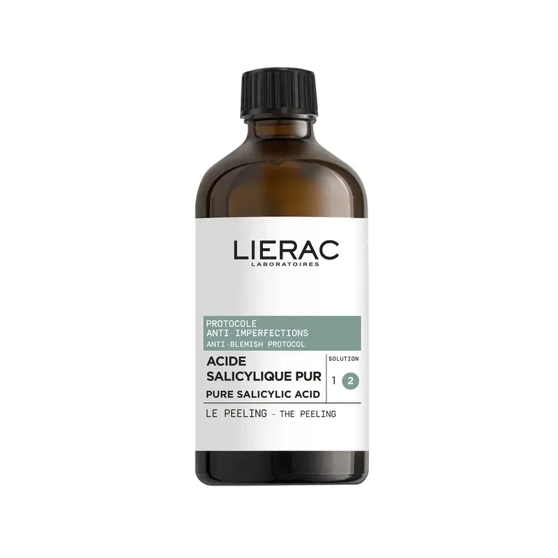 Soin peeling LIERAC à l'Acide Salicylique Pur 100ml, exfolie en douceur, réduit les imperfections, resserre les pores et illumine le teint des peaux mixtes à grasses.