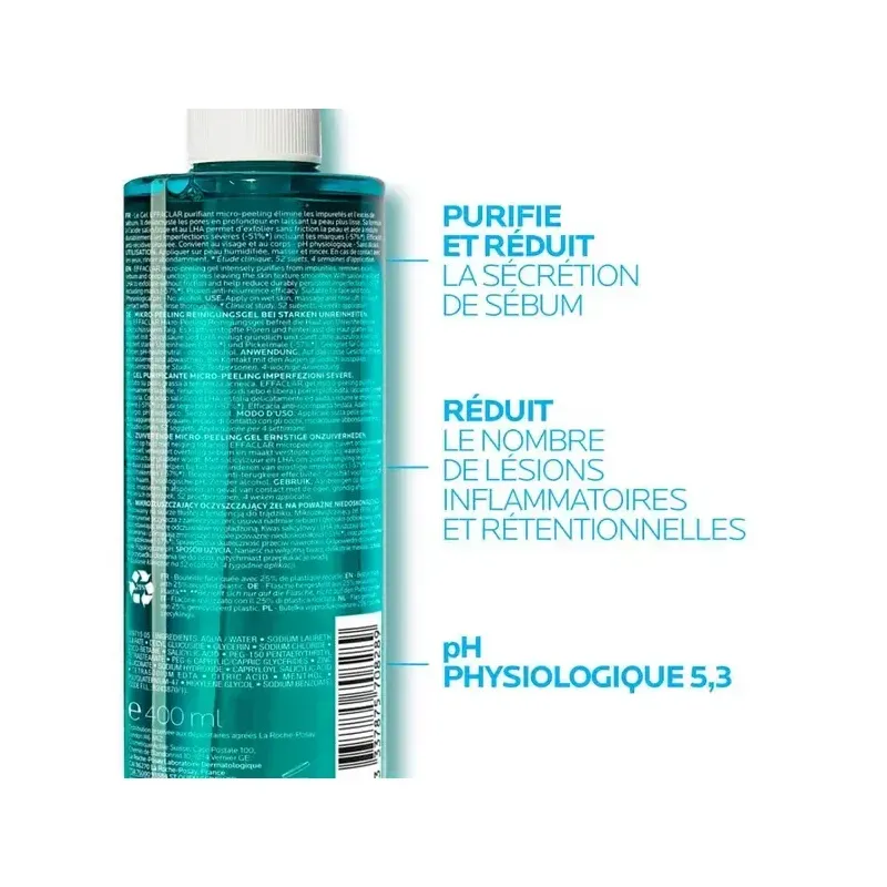 La Roche-Posay Effaclar Duo Gel Purifiant Micro-Peeling (400 ml) est un nettoyant quotidien intense, spécialement formulé pour les peaux grasses à tendance acnéique, y compris celles présentant des imperfections sévères, des marques persistantes et des pores obstrués. Ce gel douche/nettoyant exfoliant aide à désobstruer les pores en profondeur, à lisser le grain de peau et à réduire les imperfections et les marques, tout en respectant l'équilibre de la peau.