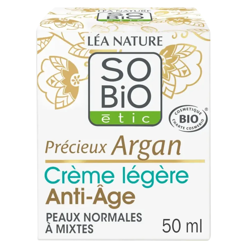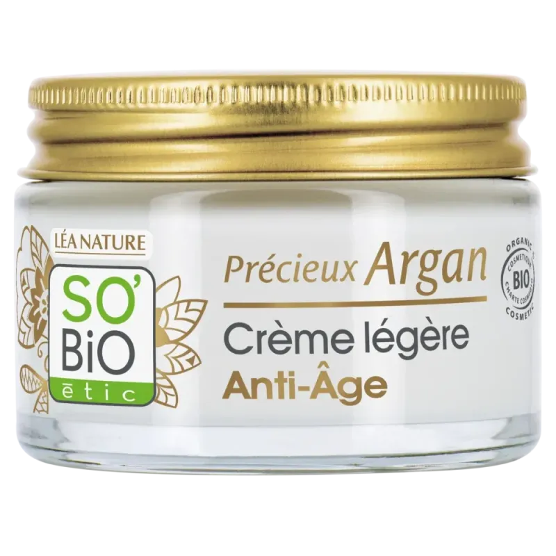 Le Soin Léger Anti-Âge Nuit Précieux Argan de SO'BiO étic est une crème de nuit spécialement formulée pour régénérer et revitaliser les peaux normales à mixtes durant leur phase de repos nocturne. Cette crème à la texture légère et non grasse, riche en Huile d'Argan Biologique, pénètre rapidement pour apporter ses bénéfices anti-âge sans étouffer la peau. Elle agit sur la fermeté et l'élasticité grâce à son complexe anti-âge (huile d'argan et acides aminés) qui aide à lisser les traits et à réduire l'apparence des premières rides. Au réveil, la peau est reposée, fraîche, et visiblement plus lisse.