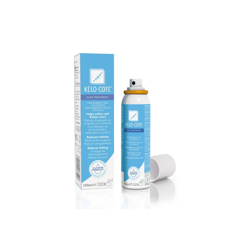 Spray KELO-COTE 100ML. Traitement de la cicatrice à base de silicone en spray. Il aplanit, assouplit et atténue les cicatrices hypertrophiques et chéloïdes sur les zones étendues, avec une application rapide et sans contact.