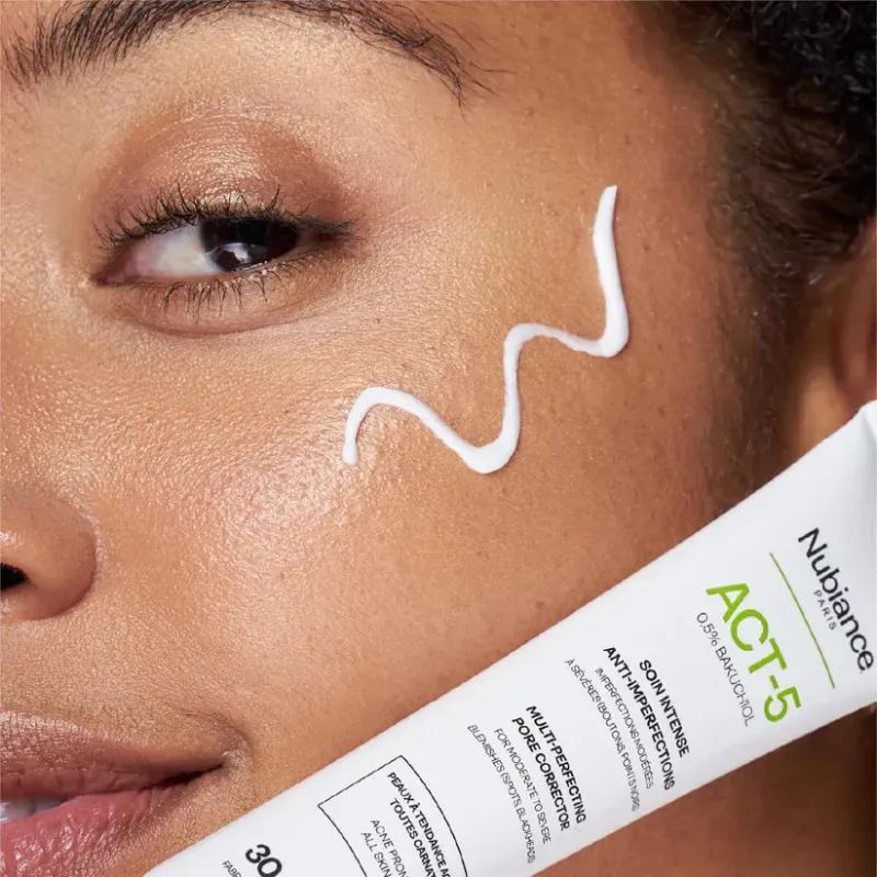 Le soin ciblé NUBIANCE ACT5, corrige et prévient les cinq signes des peaux à imperfections, y compris les marques résiduelles, pour un teint net et matifié.