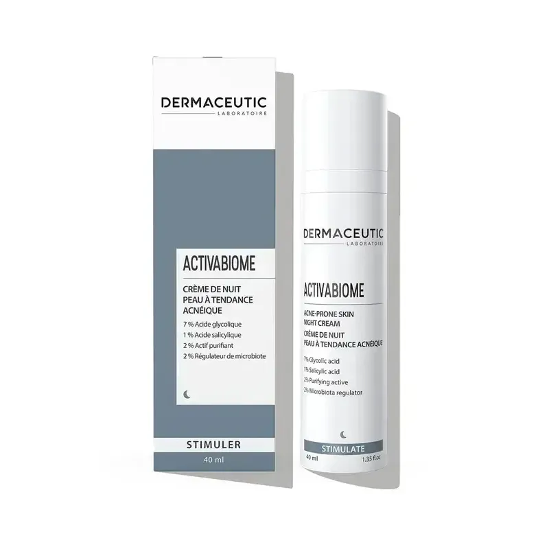 DERMACEUTIC ACTIBIOME est une crème de nuit régulatrice et apaisante, spécialement formulée pour les peaux mixtes à grasses et à imperfections. Sa formule unique, riche en prébiotiques et en acide salicylique, agit pendant le sommeil pour rééquilibrer le microbiome cutané, réduire les imperfections et lisser le grain de peau.