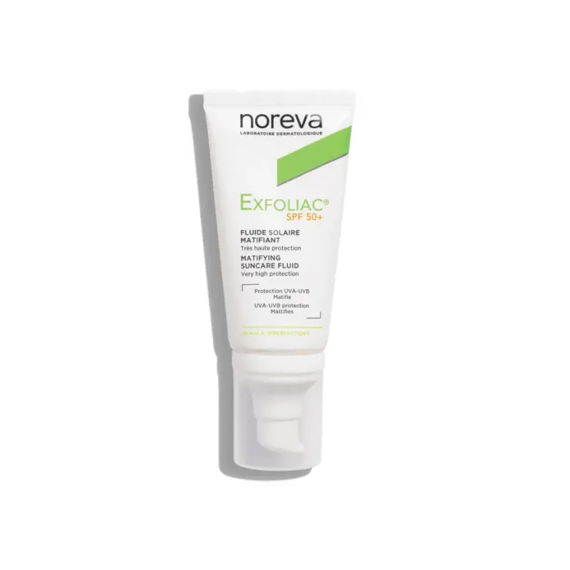 Fluide solaire NOREVA EXFOLIAC très haute protection SPF 50+ qui protège, régule le sébum et matifie les peaux grasses à imperfections.