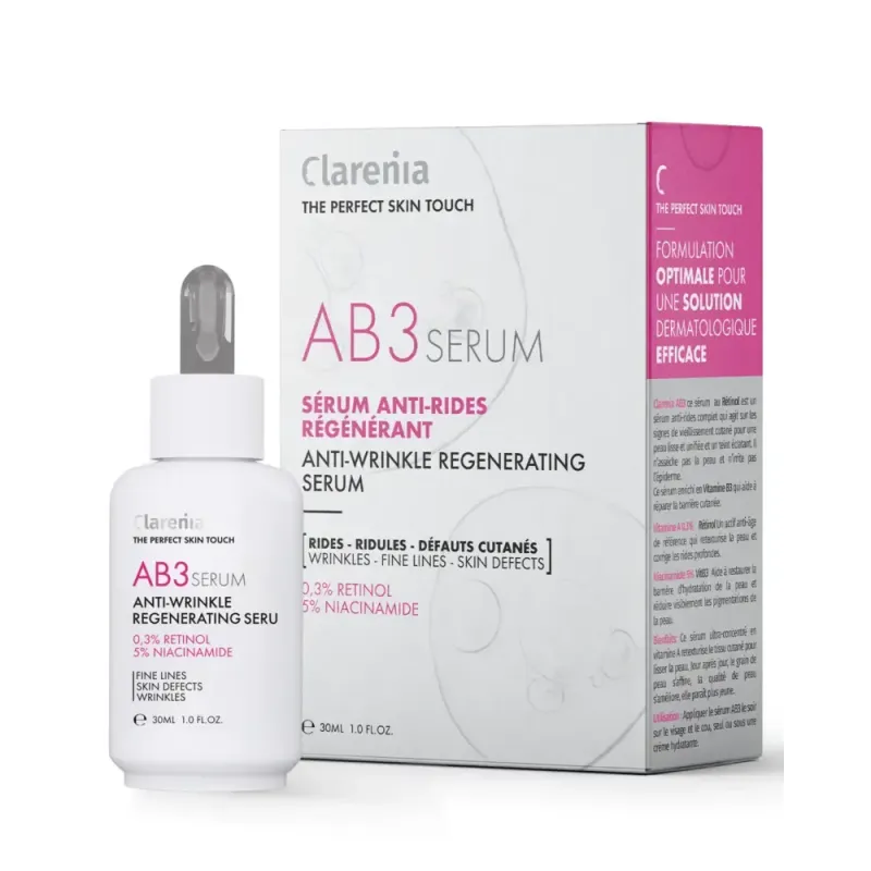 Le Sérum Anti-Rides Régénérant AB3 Clarenia est un soin anti-âge puissant, hautement concentré, conçu pour cibler les signes visibles du vieillissement cutané. Sa formule avancée, enrichie en actifs régénérants et repulpants, agit en profondeur pour lisser les rides et les ridules, améliorer la fermeté et l'élasticité de la peau, et restaurer la densité du visage. Il favorise le renouvellement cellulaire et stimule la production de collagène, laissant la peau plus lisse, plus ferme et visiblement plus jeune. Sa texture légère et non grasse pénètre instantanément, permettant une application efficace avant la crème de jour ou de nuit.
