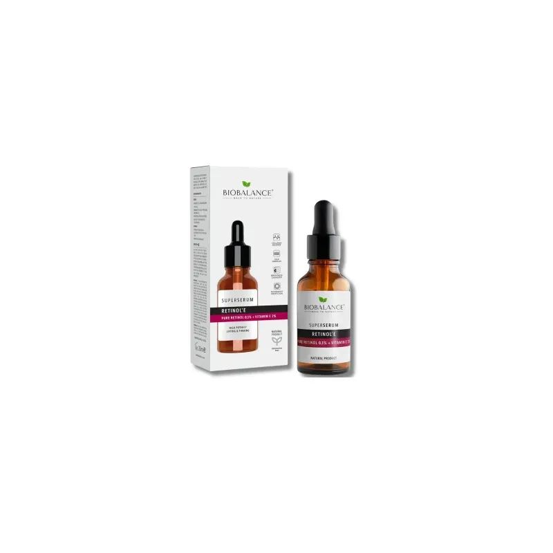 Rajeunissez l'apparence de votre peau avec le Biobalance Super Serum Retinol'E 30ml, un sérum anti-âge puissant conçu pour cibler les signes visibles du vieillissement. Formulé avec du Rétinol (Vitamine A), un ingrédient de référence en dermatologie, ce sérum travaille en profondeur pour accélérer le renouvellement cellulaire et stimuler la production de collagène. Il est enrichi en Vitamine E, un antioxydant qui protège la peau et aide à stabiliser le rétinol. Ce sérum multi-action réduit visiblement l'apparence des rides et ridules, améliore la fermeté et l'élasticité de la peau, estompe les taches pigmentaires et affine le grain de peau. Sa texture légère et soyeuse est rapidement absorbée, laissant la peau incroyablement lisse, uniforme et visiblement plus jeune et éclatante. Une utilisation régulière révèle un teint rajeuni, plus tonique et d'apparence plus saine.
