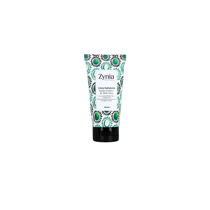 Crème hydratante Zynia Huile d'Olive et Aloe Vera (150 ml), enrichie en actifs naturels pour nourrir intensément les peaux sèches et sensibles, tout en apaisant les irritations et en favorisant la réparation cutanée.