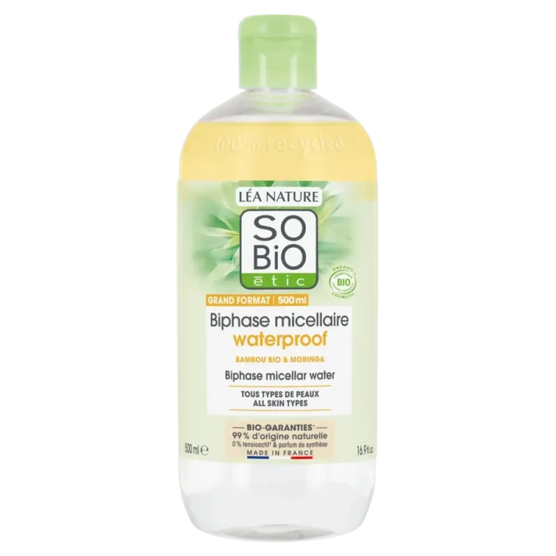 Eau micellaire biphasique bio, démaquillant ultra-efficace pour le maquillage waterproof, nourrissant et doux pour la peau.