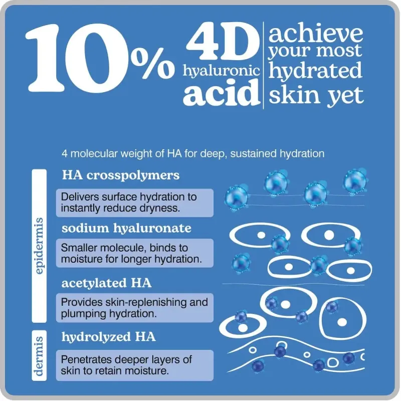 Hydratation multicouche : L'Acide Hyaluronique 4D hydrate la peau en profondeur et en surface pour un effet repulpant.