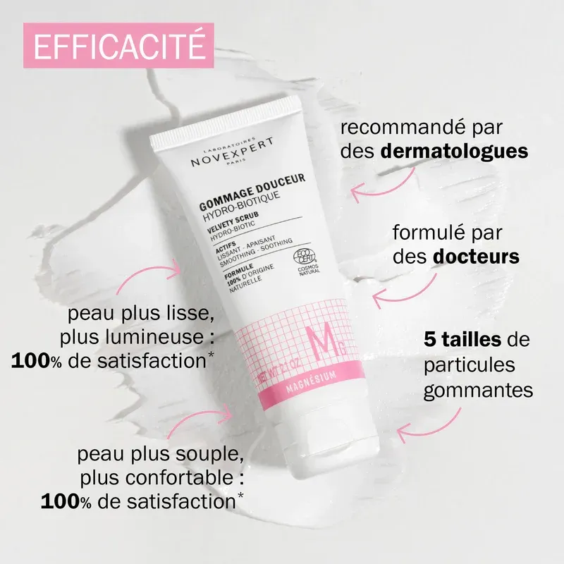 Le NOVEXPERT GOMMAGE DOUCEUR HYDRO BIOTIQUE 60ML est un soin exfoliant visage ultra-délicat spécialement formulé pour les peaux sensibles, sèches et fragiles. Ce gommage, issu de la gamme Magnésium, est le premier gommage compatible avec les peaux réactives. Il se distingue par son approche globale "Hydro-Biotique" qui agit à trois niveaux. Il offre un effet "peau neuve" en douceur grâce à un mélange de 5 tailles de microparticules naturelles (Bambou et Jojoba) qui assurent un gommage complet en deux étapes : exfoliation des cellules mortes et polissage du grain de peau. L'association du Magnésium apaisant et de prébiotiques et probiotiques contribue à restaurer le confort cutané et l'éclat du teint, sans agresser la barrière cutanée.