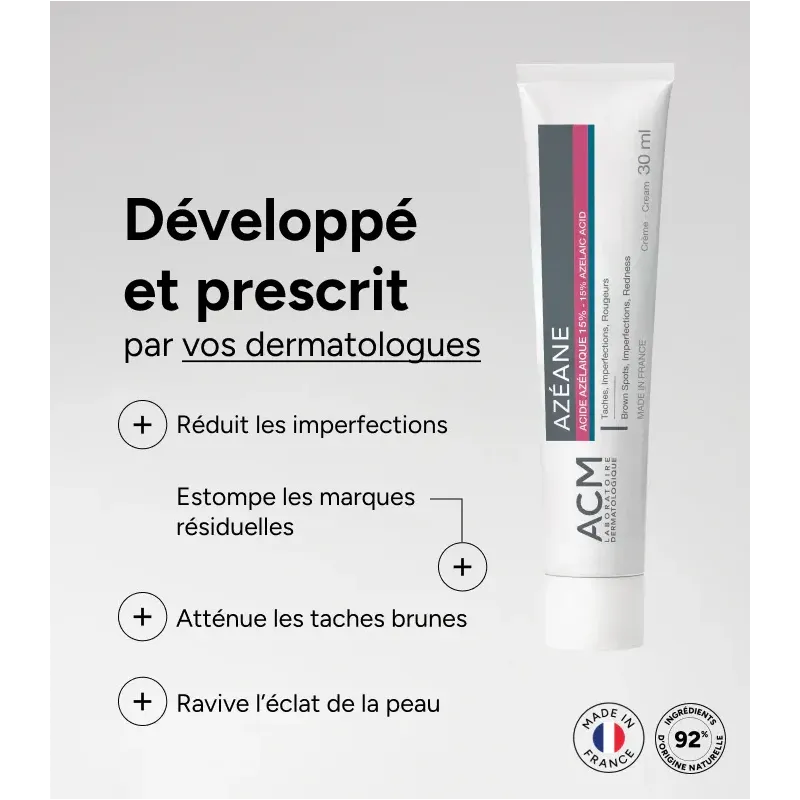 Un soin dermatologique ciblé, formulé pour corriger et améliorer l'aspect des peaux présentant diverses imperfections telles que les taches brunes, les rougeurs et les boutons. L'acide azélaïque, son actif principal, est reconnu pour ses multiples propriétés bénéfiques pour la peau.