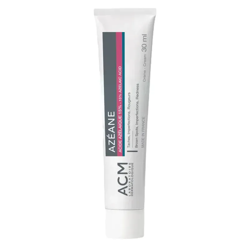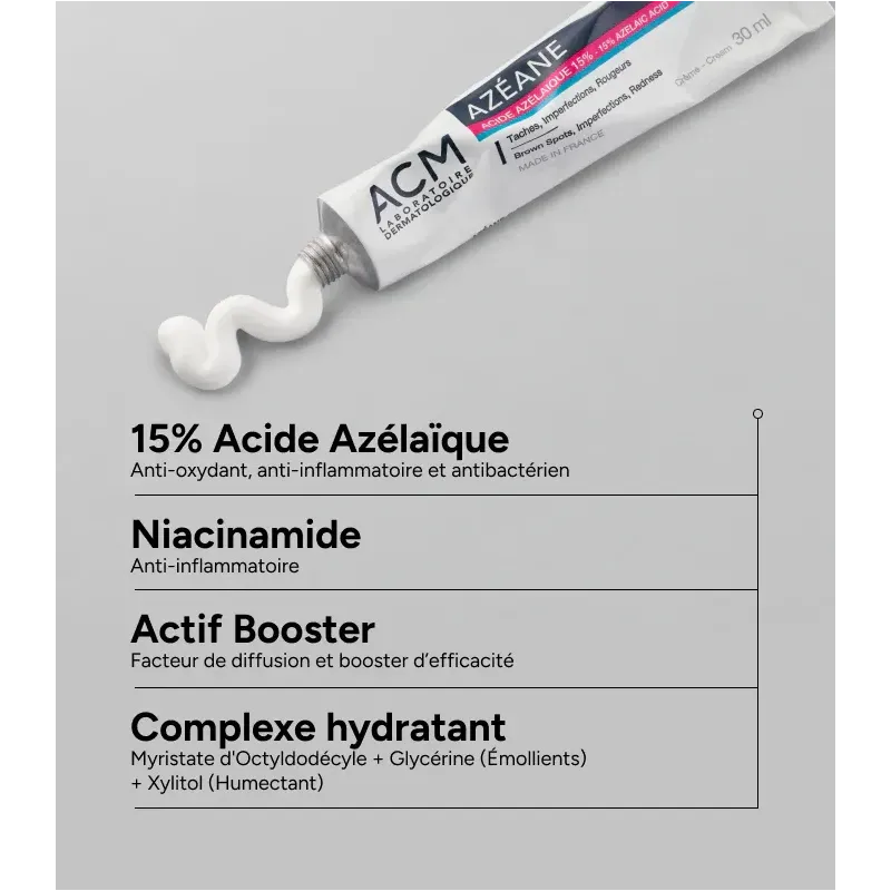 La crème ACM AZEANE est un soin multifonction spécialement conçu pour les peaux mixtes à grasses sujettes aux imperfections et aux rougeurs. Sa formule, enrichie en acide azélaïque (15%), agit en profondeur pour unifier le teint, réguler l'excès de sébum et réduire l'apparence des imperfections, des taches et des rougeurs. L'acide azélaïque est un actif dermatologique reconnu pour ses propriétés antibactériennes et anti-inflammatoires. Il aide à réduire la prolifération de la bactérie responsable de l'acné, à désobstruer les pores et à lisser le grain de peau. La crème contient également des agents matifiants qui contrôlent la brillance et laissent un fini doux et velouté. Sa texture gel-crème, légère et non grasse, pénètre rapidement, offrant un confort immédiat et laissant la peau plus lisse, plus mate et plus uniforme.