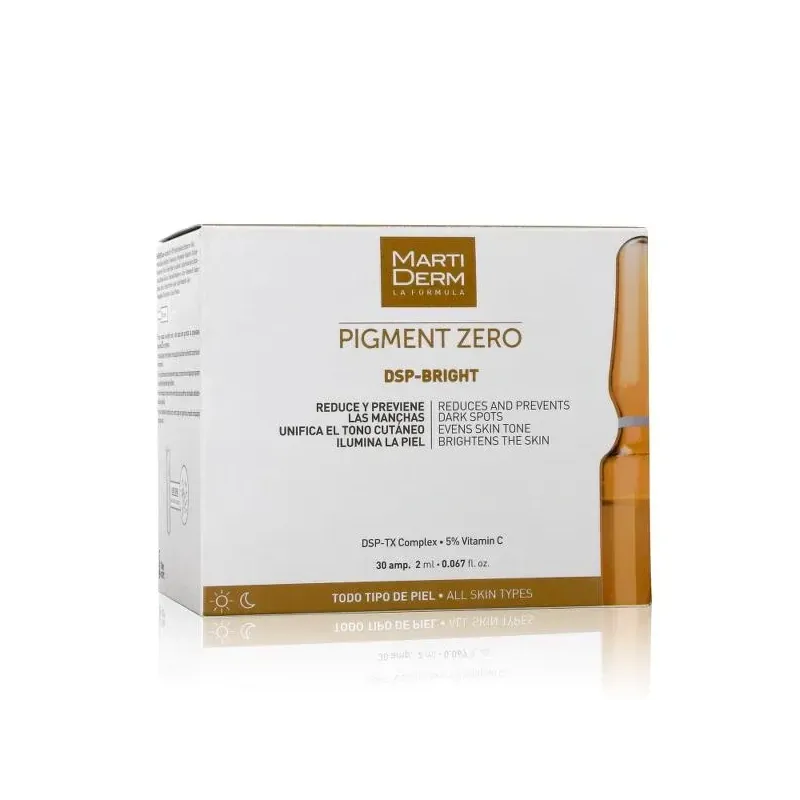 Ampoules MARTIDERM DSP-BRIGHT (x30), sérum dépigmentant intensif au complexe DSP-TX et Vitamine C. Elles corrigent les taches, préviennent leur réapparition et révèlent un teint parfaitement uniforme et lumineux.
