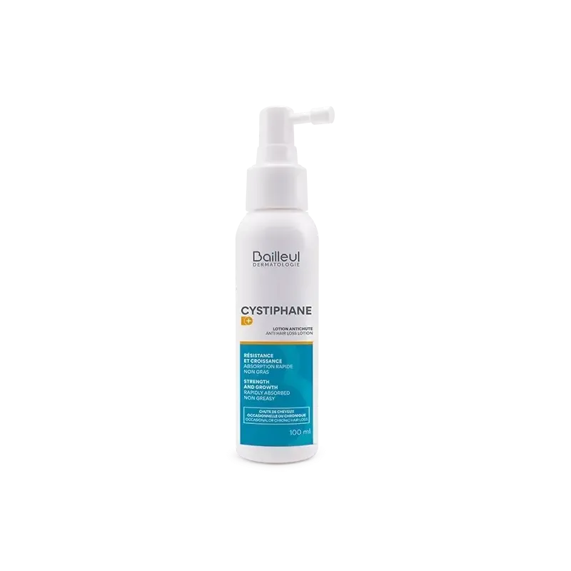CYSTIPHANE LOTION ANTI-CHUTE est une lotion en spray sans rinçage, spécialement conçue pour lutter contre la chute de cheveux chronique ou saisonnière. Sa formule concentrée agit en profondeur sur le cuir chevelu pour stimuler la croissance, renforcer la fibre capillaire et réduire la chute. Elle contient des actifs qui agissent en synergie pour revitaliser les follicules pileux, comme le viniférine (extrait de vigne) qui stimule la microcirculation et le pyrithione de zinc qui aide à assainir le cuir chevelu et à réduire la prolifération des micro-organismes. Cette lotion est idéale pour une utilisation quotidienne et peut être utilisée seule ou en complément du shampooing et des compléments alimentaires de la même gamme pour une efficacité optimale.