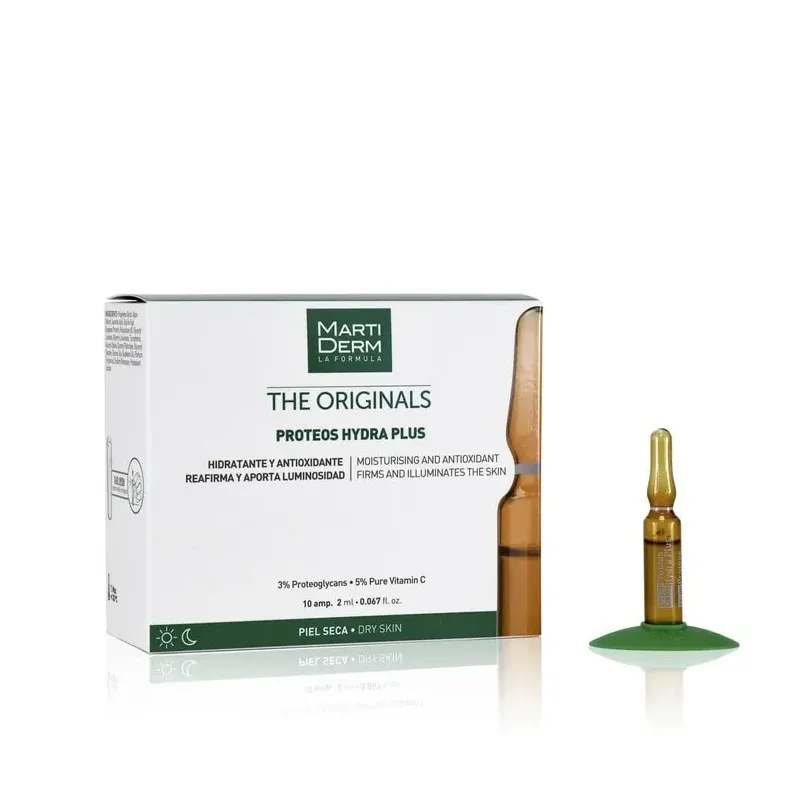 Ampoules MARTIDERM Proteos Hydra Plus (x10) pour peaux sèches, hydratant intensif et anti-âge aux Protéoglycanes et Vitamine C Pure. Elles restaurent l'élasticité, éliminent les tiraillements et offrent un éclat lumineux.
