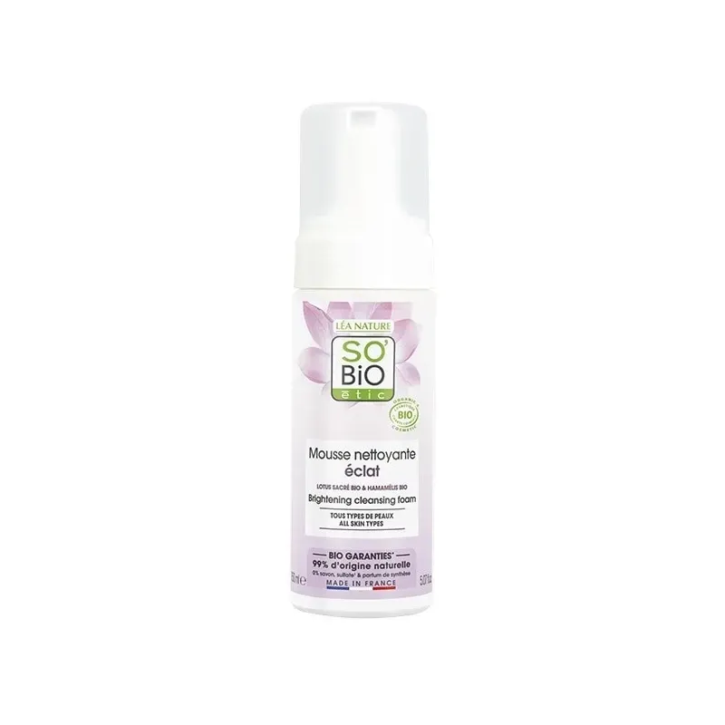 La Mousse Nettoyante Éclat au Lotus Sacré Bio de SO'BiO étic est un soin nettoyant et démaquillant à la texture mousse aérienne et généreuse. Elle s'inscrit dans la gamme "Pour une Peau Parfaite" et agit sur les trois dimensions de la qualité de la peau : pores, grain de peau et teint. Sa formule ultra-douce nettoie la peau des impuretés, des traces de maquillage et de la pollution sans l'agresser. Elle est enrichie d'un complexe breveté à base de Fleur de Lotus Sacré Bio, d'Hamamélis Bio et de Zinc qui contribue à purifier, resserrer les pores et révéler l'éclat du teint. Dès la première utilisation, la peau est nette et fraîche. Jour après jour, le grain de peau est affiné et le teint est unifié et lumineux.