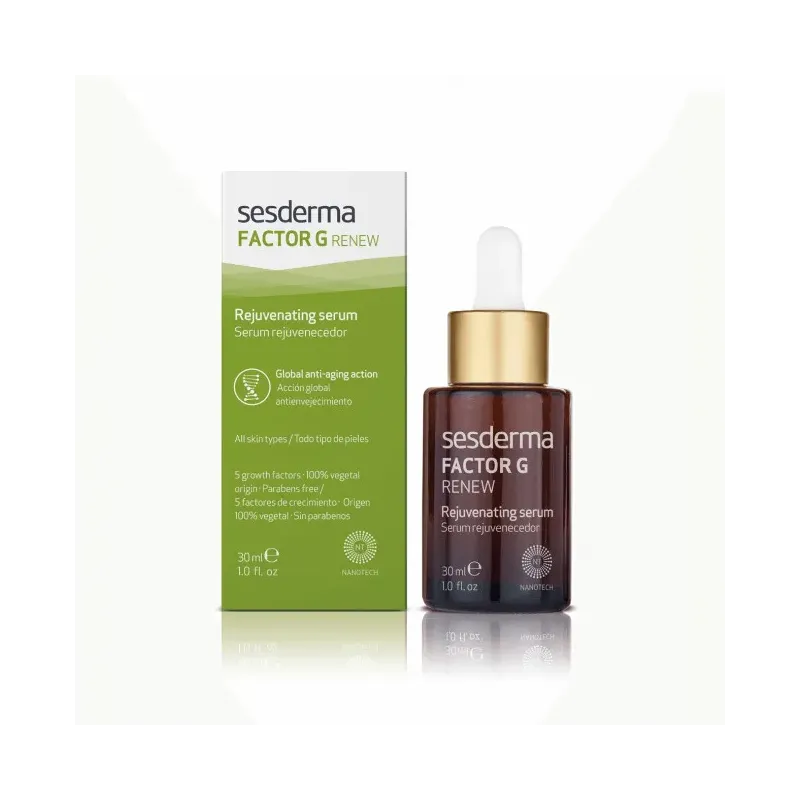Le SESDERMA FACTOR G SERUM RENEW REJUVENATING 30ML est un sérum anti-âge intensif de haute technologie, conçu pour prévenir et corriger les signes du vieillissement cutané sur tous les types de peaux, y compris les peaux sensibles. Ce produit vedette utilise la Nanotech de Sesderma pour encapsuler 7 facteurs de croissance d'origine 100% végétale dans des liposomes, assurant une tolérance maximale et une pénétration optimale des actifs jusqu'aux couches profondes de la peau. Agissant comme un puissant messager cellulaire, ce sérum réactive les mécanismes de régénération de la peau pour la rendre plus ferme, plus lisse et plus élastique.
