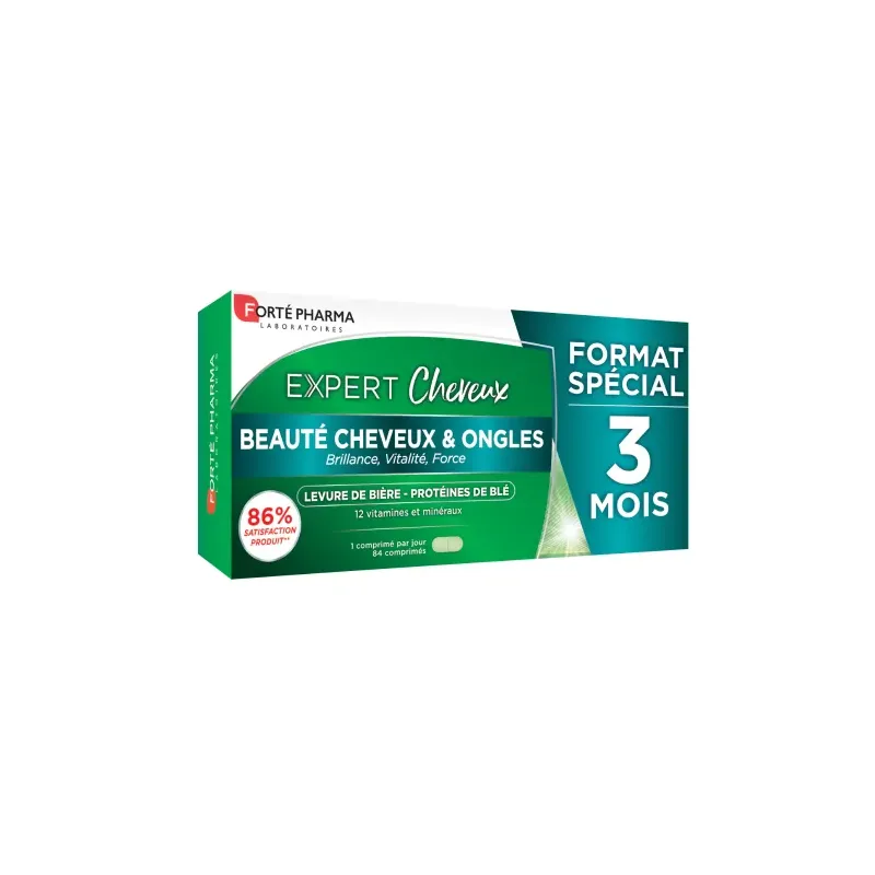 Le Pack 3 Mois Forté Pharma Expert Cheveux est un programme complet et économique conçu pour revitaliser les cheveux, freiner leur chute et stimuler leur croissance, tout en renforçant leur résistance et leur éclat. Idéal pour les chutes de cheveux saisonnières ou occasionnelles, les cheveux ternes, fragiles ou cassants, ce pack aide à améliorer la santé globale de la chevelure et des ongles. Ce complément alimentaire agit de l'intérieur grâce à une formule riche en nutriments essentiels : Kératine hydrolysée, principal constituant du cheveu et de l'ongle, qui fournit les acides aminés nécessaires à la synthèse de la kératine naturelle ; Vitamines du groupe B (B3, B5, B6, B8 - Biotine, B9), essentielles au métabolisme des cellules capillaires et à la réduction de la fatigue (la Biotine étant clé pour des cheveux normaux) ; Zinc et Sélénium, puissants antioxydants qui protègent les cellules et contribuent au maintien de cheveux et ongles normaux ; et Fer, essentiel au transport de l'oxygène pour les follicules pileux. La Prêle est également incluse pour ses propriétés reminéralisantes et fortifiantes. Ce programme de 3 mois permet une action en profondeur et durable pour des cheveux plus forts, plus denses, plus brillants et moins sujets à la chute.