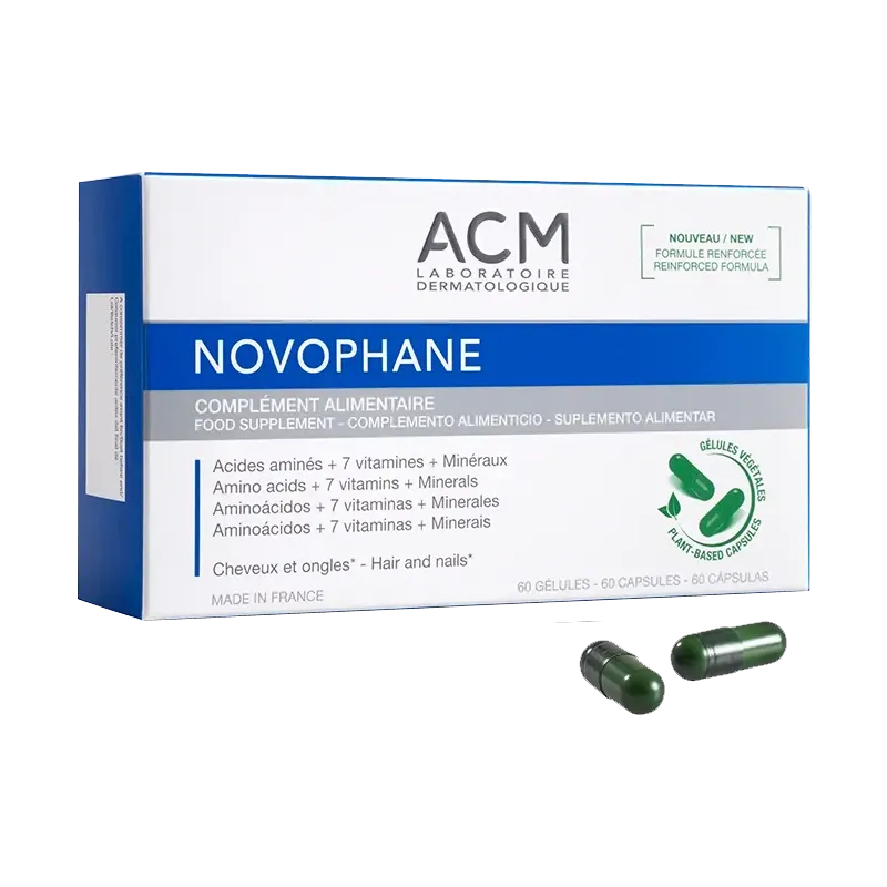 Les Gélules Novophane Ongles & Cheveux d'ACM sont un complément nutritionnel oral qui apporte un concentré d'éléments essentiels (vitamines, minéraux, acides aminés soufrés) pour nourrir et soutenir la croissance saine des phanères (cheveux et ongles) de l'intérieur. Il est particulièrement recommandé en cas de :