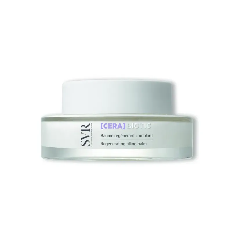 Le baume BIOTIC [CERA] de SVR est un soin régénérant et comblant, conçu pour les peaux matures, sèches à très sèches. Sa formule, inspirée des avancées de la microbiologie cutanée, est un concentré d'actifs puissants pour une action globale sur les signes de l'âge : manque de fermeté, rides et déshydratation. Il est enrichi en Probiotiques Pasteurisés qui renforcent et protègent la barrière cutanée, en Acide Hyaluronique de bas poids moléculaire qui hydrate et repulpe la peau en profondeur, et en Céramides, des lipides essentiels qui restaurent la barrière de la peau. Sa texture baume, riche et onctueuse, nourrit intensément, apaise les sensations de tiraillement et laisse la peau douce et confortable. Il offre un confort immédiat et durable, et agit jour après jour pour une peau visiblement plus ferme, plus lisse et mieux hydratée.