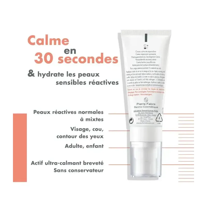 D-Sensinose™ (actif postbiotique breveté) : Cet actif innovant, directement issu de l'Eau Thermale d'Avène, est la clé de l'action apaisante. Il agit pour calmer la peau en 30 secondes en réduisant l'hyper-réactivité des neurones sensoriels cutanés. Il soulage les sensations d'inconfort et diminue l'irritabilité cutanée.