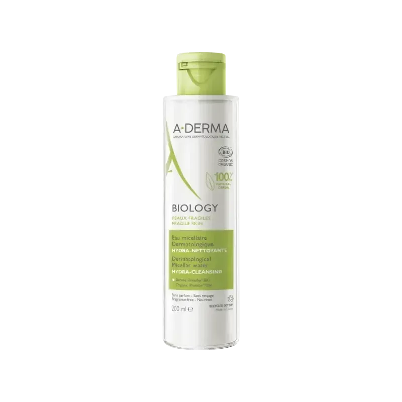 L'A-Derma Biology Eau Micellaire Dermatologique Hydra-Nettoyante 200ml est un soin nettoyant et démaquillant certifié bio, conçu pour les peaux fragiles du visage et du contour des yeux. Sa formule douce et 100% d'origine naturelle élimine efficacement les impuretés et le maquillage sans dessécher la peau, tout en renforçant la barrière cutanée. C'est l'allié idéal pour une toilette rapide et sans rinçage.