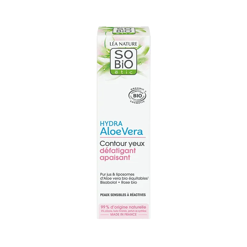 Le Contour Yeux Apaisant Hydra Aloe Vera de SO'BiO étic est un soin haute tolérance spécialement formulé pour la peau délicate, sensible et réactive du contour de l'œil. Sa texture ultra-fine et fraîche pénètre rapidement pour apporter une double action : il apaise instantanément les sensations d'inconfort et les irritations, tout en assurant une hydratation intense et durable. Il est enrichi en Pur Jus d’Aloe Vera Bio équitable sous forme de liposomes pour une meilleure pénétration et efficacité hydratante. Jour après jour, les ridules de déshydratation sont estompées et la peau est renforcée. L'ajout de Cire de Blé noir cible les marques de fatigue et contribue à l'effet anti-poches.