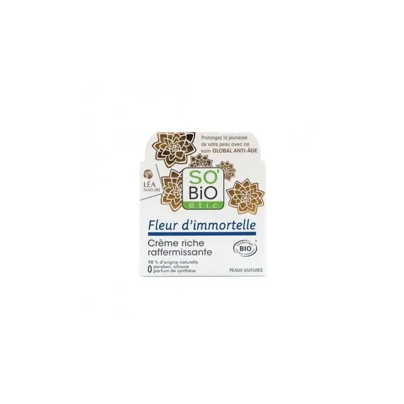 Soin visage biologique à la Fleur d'Immortelle, cette crème riche raffermissante atténue les rides, nourrit intensément et remodèle l'ovale du visage pour une peau plus ferme et élastique.