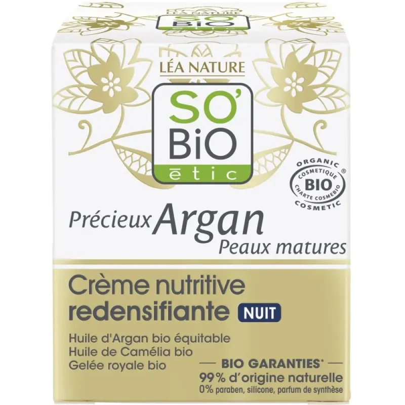La Crème Nutritive Redensifiante Nuit Précieux Argan Peaux Matures de SO'BiO étic est un soin de nuit intensif conçu pour les besoins spécifiques des peaux fragilisées, affinées par l'âge et manquant de densité. Pendant la nuit, période de renouvellement cellulaire optimal, cette crème apporte une réponse complète : elle nourrit intensément, régénère et aide à redensifier la peau. Sa formule est riche en Huile d'Argan Biologique et enrichie d'actifs qui stimulent la production de collagène. Sa texture onctueuse et réconfortante enveloppe la peau, atténuant les sensations de tiraillement. Au réveil, la peau est plus souple, nourrie, le contour du visage paraît remodelé et la peau retrouve un aspect plus dense et rebondi.