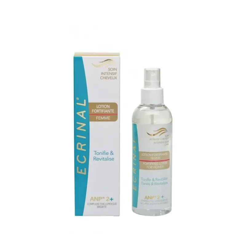 La Lotion Fortifiante Femme à l'ANP® 2+ ECRINAL est un soin capillaire spécialement formulé pour les cuirs chevelus clairsemés et les cheveux dévitalisés. Agissant comme un traitement d'entretien, elle est souvent recommandée en relais d'un traitement anti-chute plus intensif (comme les Ampoules à l'ANP® 2+). Enrichie en actifs puissants, elle travaille à fortifier la fibre capillaire de la racine aux pointes et à stimuler le bulbe pileux pour favoriser la pousse de cheveux plus forts et tonifiés. Sa formule bi-phasée (à agiter avant emploi), non grasse et non collante, pénètre rapidement sans alourdir le cheveu. Elle redonne instantanément à la chevelure douceur, volume et brillance, tout en laissant un parfum frais et raffiné.