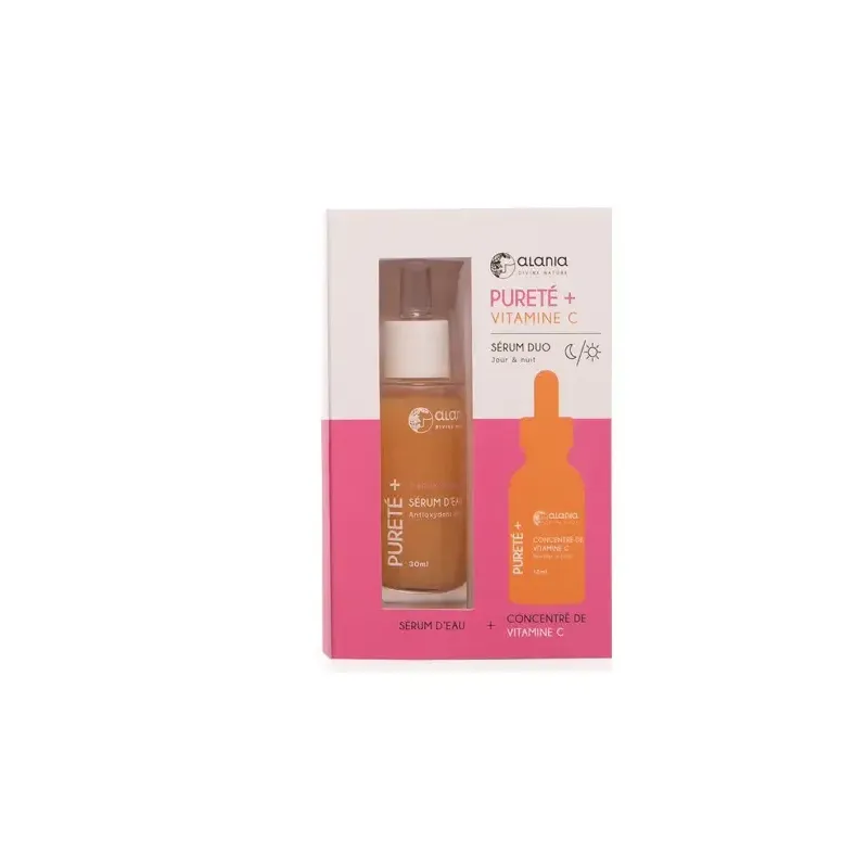 ALANIA PURETÉ+ VITAMINE C SÉRUM DUO JOUR ET NUIT (30ML + 12ML) est un système de soin innovant conçu pour une action ciblée 24 heures sur 24 afin d'illuminer, d'hydrater et de lutter contre les signes du vieillissement. Ce duo se compose de deux sérums complémentaires : un Sérum d'Eau PURETÉ+ (Jour), léger et hydratant, et un Concentré de VITAMINE C (Nuit), un puissant "booster d'éclat" hautement concentré. L'action combinée permet de protéger la peau des agressions extérieures pendant la journée et de la régénérer en profondeur pendant la nuit, assurant un teint frais, éclatant et visiblement lifté.