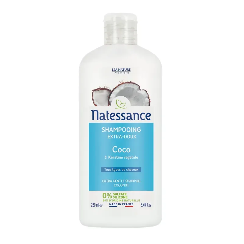 Shampooing Natessance Coco 250ml, soin capillaire sans silicone qui nourrit et hydrate les cheveux normaux à secs grâce à l'Huile de Coco. Il apporte brillance et souplesse, tout en laissant un parfum exotique gourmand.