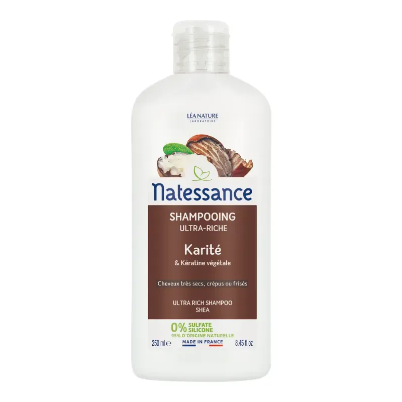 Shampooing Crème Natessance Karité 250ml, soin ultra-nourrissant sans silicone pour cheveux très secs et abîmés. Sa texture crème et son Beurre de Karité BIO nettoient en douceur, réparent la fibre et apportent souplesse et brillance.