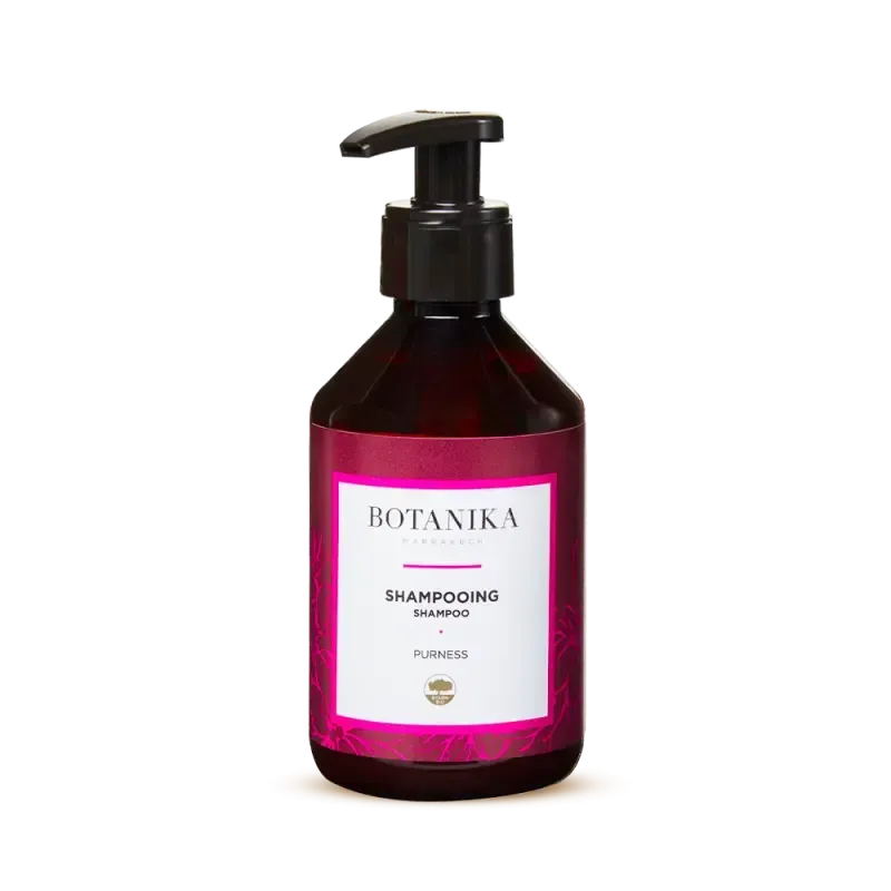 Shampoing PURNESS (250ml) BOTANIKA, riche en extrait de feuilles d'arganier et huile essentielle de géranium. Sa formule astringente et équilibrante est idéale pour les cheveux gras, leur redonnant souplesse et brillance grâce à la protéine de soie.