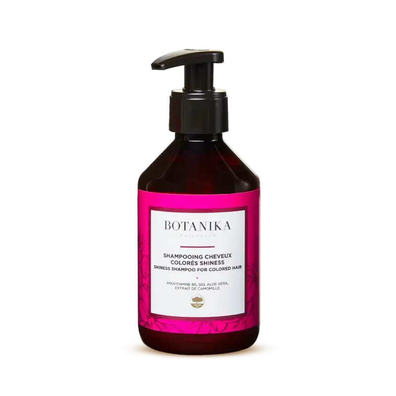 Shampoing CHEVEUX COLORÉS SHINESS (250ml) BOTANIKA, sans sulfate, enrichi en Protéine de Soie, Extrait d'Arganier, Huile d'Olive, Miel et Karité. Il préserve la couleur et l'éclat des cheveux colorés ou méchés, tout en les nourrissant et les protégeant.