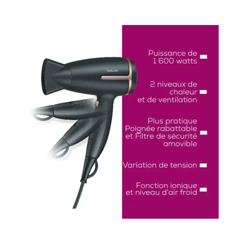 Sèche-cheveux de voyage Beurer HC 25, puissant (1600 W) et compact. Il est doté d'un manche pliable, de 2 niveaux de vitesse et de chauffe, d'une touche d'air froid et d'un embout concentrateur. Sa fonction bi-tension le rend parfait pour les voyages.