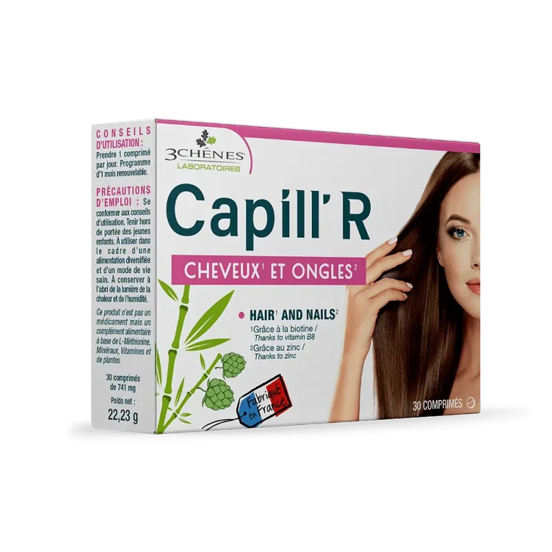 3 CHENES CAPILL'R CHEVEUX ET ONGLES 30 COMPRIMÉS est un complément alimentaire des laboratoires Les 3 Chênes, formulé spécifiquement pour la santé et la beauté des cheveux et des ongles. Il vise à compenser les carences nutritionnelles qui peuvent les fragiliser.
