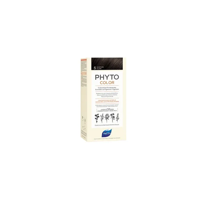 Kit de coloration permanente N°5 Châtain Clair, enrichi en pigments végétaux, il garantit une couverture totale des cheveux blancs et une couleur intense tout en respectant la fibre capillaire et le cuir chevelu.