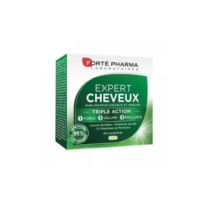 Forté Pharma Expert Cheveux 28 comprimés est un complément alimentaire conçu pour fortifier les cheveux, freiner leur chute et stimuler leur croissance. Il est idéal pour ceux qui constatent une perte de cheveux occasionnelle ou saisonnière, des cheveux affaiblis, ternes, ou qui souhaitent simplement améliorer la vitalité et l'éclat de leur chevelure et de leurs ongles. Ce programme d'un mois apporte les nutriments essentiels pour agir de l'intérieur sur la santé capillaire. Sa formule contient des actifs clés : la Kératine hydrolysée, composant principal du cheveu ; des Vitamines du groupe B (B3, B5, B6, B8 - Biotine, B9), cruciales pour le métabolisme cellulaire du follicule pileux (la Biotine étant particulièrement reconnue pour des cheveux normaux) ; le Zinc et le Sélénium, oligo-éléments qui contribuent au maintien de cheveux et d'ongles normaux et protègent les cellules ; et le Molybdène, qui participe au métabolisme des acides aminés soufrés. Ce complément soutient la microcirculation au niveau du cuir chevelu et apporte les éléments constitutifs pour des cheveux plus forts, plus denses, plus résistants à la casse et plus brillants, tout en favorisant un cuir chevelu sain.