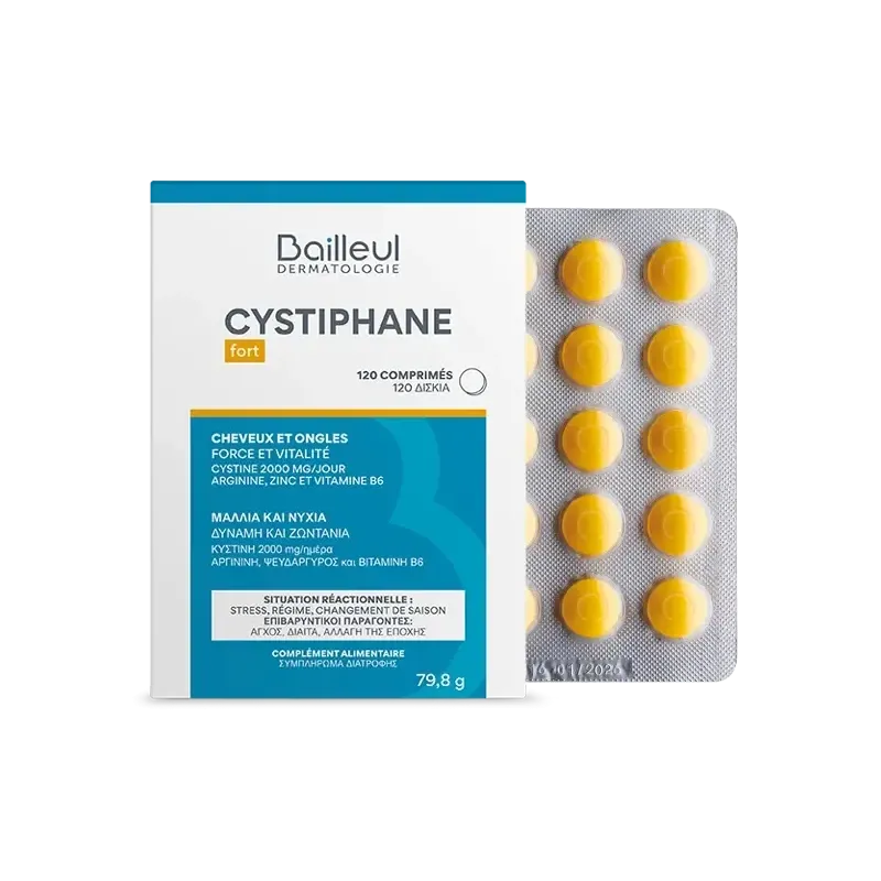 CYSTIPHANE CHEVEUX ET ONGLES est un complément alimentaire conçu pour renforcer les cheveux et les ongles. Sa formule unique associe des ingrédients essentiels pour la synthèse de la kératine, la protéine structurelle qui compose la fibre capillaire et les ongles. Il est riche en Cystine, un acide aminé sulfuré qui est le composant principal de la kératine. Le complément contient également de la vitamine B6, qui favorise l'incorporation de la cystine dans les zones de kératinisation, du zinc qui protège les cellules du stress oxydatif et contribue au maintien des cheveux et des ongles normaux, et de l'Arginine, un autre acide aminé important. CYSTIPHANE est idéal pour les personnes ayant des cheveux fins, fragiles, qui se cassent, ou des ongles mous et dédoublés.