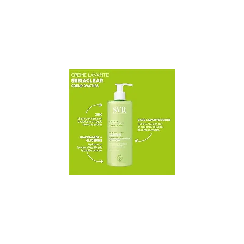 La crème lavante SEBIACLEAR de SVR est un soin nettoyant purifiant et apaisant, spécialement formulé pour les peaux à tendance acnéique. Ce nettoyant onctueux est conçu pour réduire les imperfections tout en préservant le film hydrolipidique de la peau, souvent fragilisé par les traitements anti-acné. Enrichie en niacinamide (vitamine B3) et en gluconolactone, elle offre une action purifiante et apaisante sans agresser. La niacinamide aide à réguler la production de sébum et à réduire les rougeurs, tandis que la gluconolactone purifie la peau en douceur. Sa texture crème se transforme en une mousse fine et onctueuse qui élimine les impuretés et l'excès de sébum, laissant la peau propre, fraîche et confortable. Son grand format est économique et pratique pour un usage quotidien.