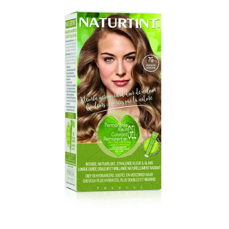 La NATURTINT Coloration Permanente 7G Blond Doré est un kit de coloration capillaire de 170 ml, conçu pour offrir une couleur durable, brillante et lumineuse dans une nuance de Blond (niveau 7) enrichie de reflets dorés (lettre G pour Gold). Ces reflets dorés sont parfaits pour apporter de la chaleur et de l'éclat aux cheveux blonds, illuminant le teint et évitant un fini mat ou cendré. Comme toutes les colorations NATURTINT, cette formule est douce, étant composée jusqu'à 92% d'ingrédients d'origine naturelle et formulée sans ammoniaque, sans résorcine, sans parabène et sans PPD (selon la version), minimisant ainsi les agressions chimiques. Elle assure une couverture des cheveux blancs jusqu'à 100% tout en soignant et en fortifiant la fibre capillaire grâce à son masque post-coloration enrichi en protéines végétales.