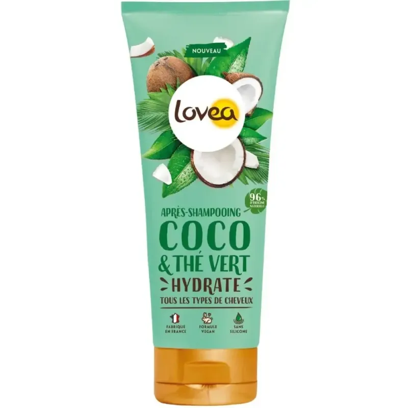 L'Après-Shampooing Coco & Thé Vert de Lovea est un soin démêlant et nourrissant spécialement conçu pour les cheveux normaux. Ce produit vise à faciliter le démêlage et à apporter un complément d'hydratation et de brillance sans alourdir la chevelure. Sa formule associe l'huile de Coco, réputée pour ses propriétés nourrissantes, au Thé Vert, un ingrédient souvent apprécié pour ses vertus tonifiantes et antioxydantes. Utilisé après le shampooing, il referme les écailles du cheveu, ce qui rend la fibre plus lisse, plus douce et plus facile à coiffer. Son parfum exotique de coco laisse les cheveux délicatement parfumés et agréables au toucher.