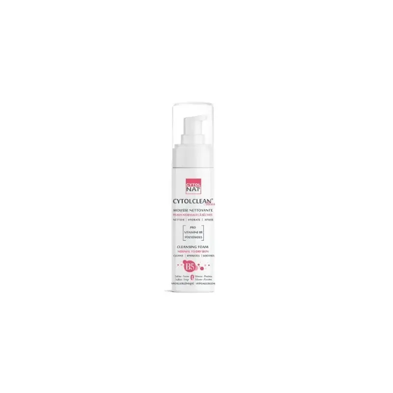 La Mousse Nettoyante CYTOL CLEAN est un soin d'hygiène visage quotidien, spécialement formulé pour le nettoyage en douceur des peaux normales à sèches. Sa texture aérienne et onctueuse se transforme en une mousse délicate qui nettoie la peau en profondeur, éliminant impuretés, maquillage et traces de pollution, sans l'agresser ni la dessécher. Enrichie en actifs hydratants et apaisants, elle respecte l'équilibre naturel de la peau et laisse une sensation de confort et de douceur après le rinçage. Elle est idéale pour une routine de soin du matin ou du soir, laissant la peau fraîche, souple et parfaitement nettoyée.